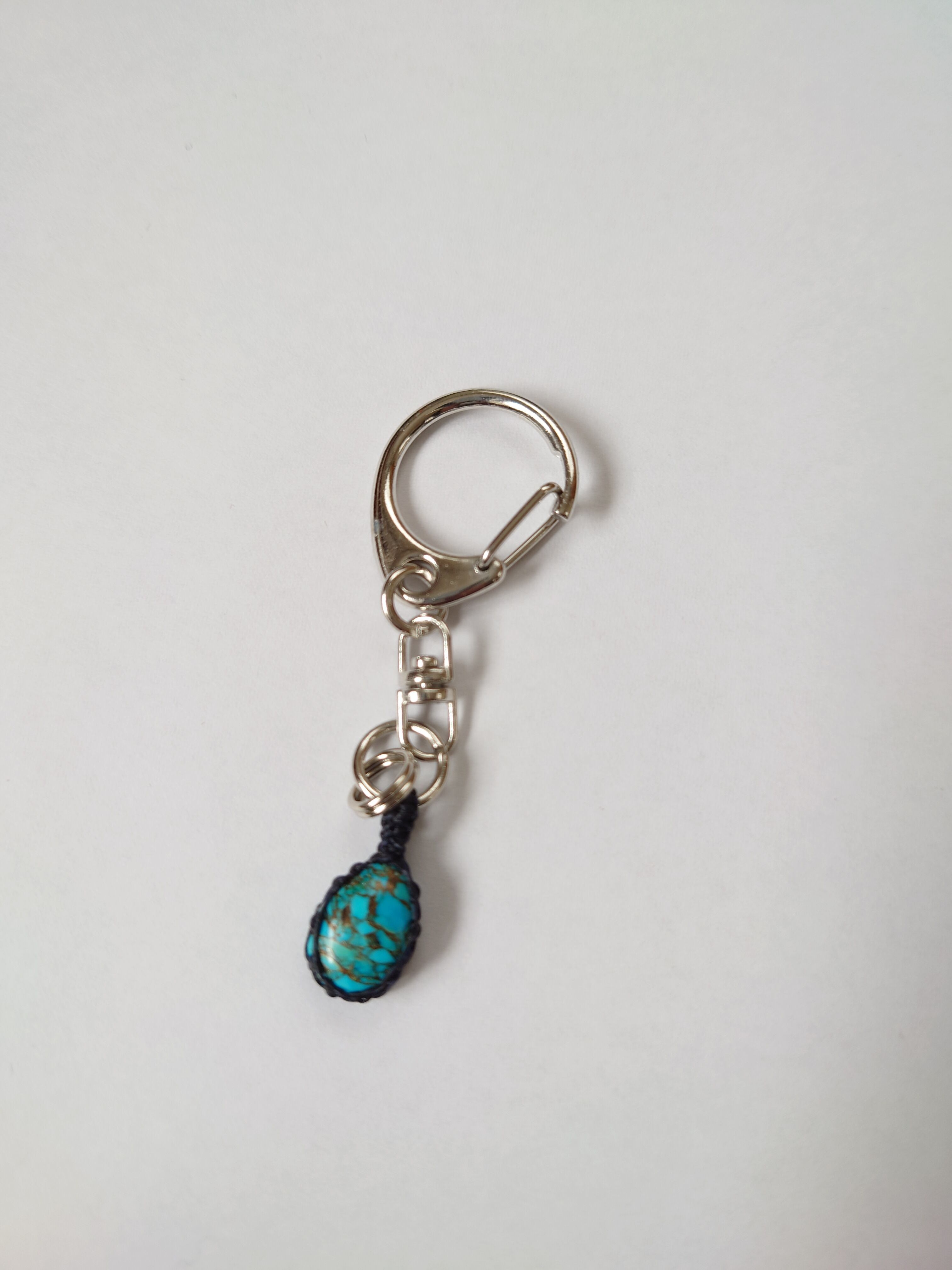 マトリックスターコイズを紺色のコード(紐)を使いマクラメ編みで周りを包みキーホルダーに仕上げました。