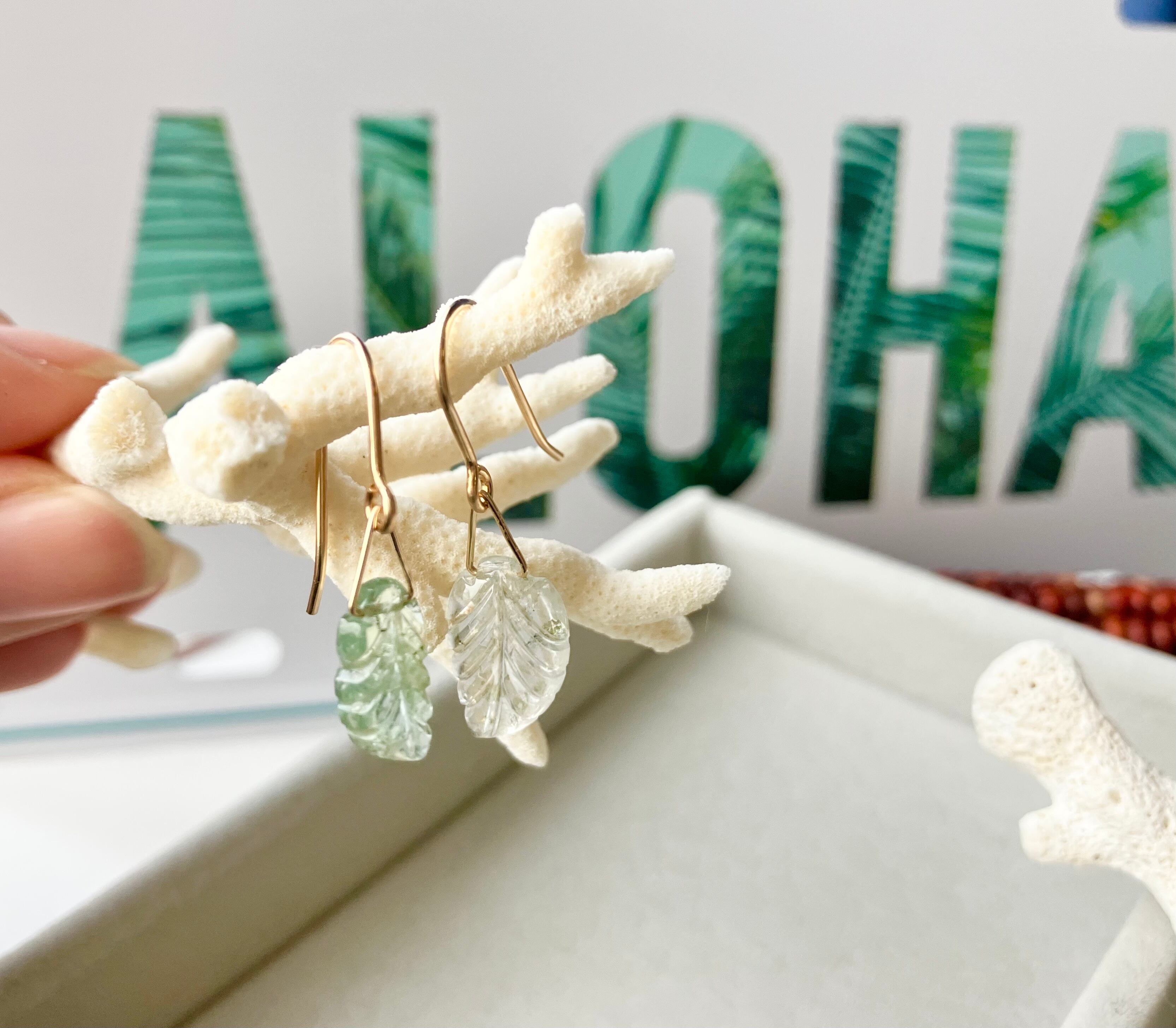 リーフ型にカービングされたトルマリンに14kgfのフックピアスで仕上げました。