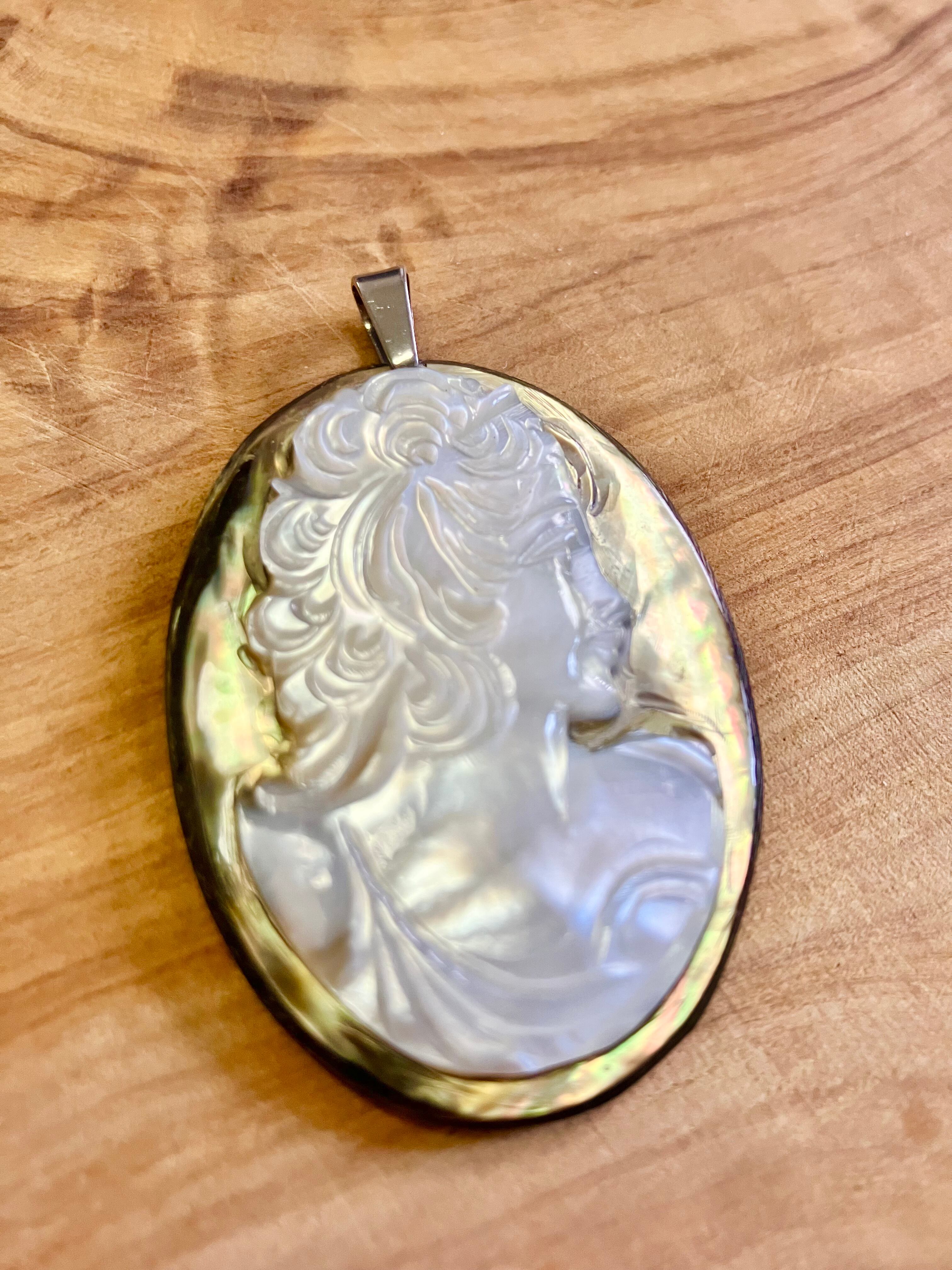 カメオは、二層または多層の素材から成る半貴石や貝殻を彫刻して作られる装飾品です。上層の部分を細かく彫り込むことで、美しい浮き彫りの肖像や風景を表現します